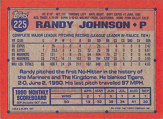 1991 Topps 40 Years Randy Johnson Baseball Error Card #225 - Mint Condition