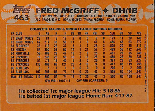 1988 Topps Fred McGriff Baseball Card Blue Jays #463 - Mint Condition