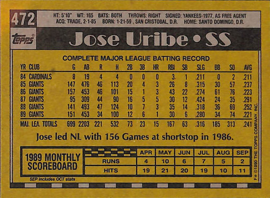 Born on January 21, 1959, in San Cristobal, Dominican Republic, José Uribe found a path from the pockmarked, rock-and-dirt baseball fields of the Dominican Republic to international baseball success. Named the All-Decade Shortstop of the 1980s for the San Francisco Giants,1 he played well in an unforgettable World Series with the team in 1989. In 2006, though, he died tragically in an automobile accident in his native country.