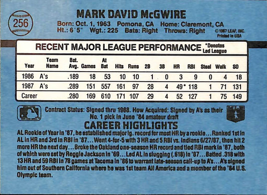 1988 Donruss Mark McGwire Baseball Card #256 - Mint Condition