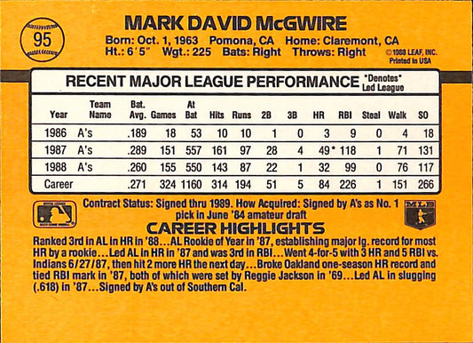 1989 Donruss Mark McGwire Baseball Card #95 - Mint Condition