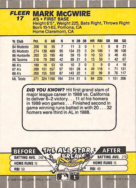 1989 Fleer Mark McGwire Baseball Card #17 - Mint Condition