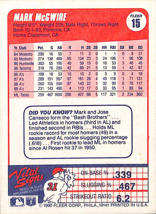 1990 Fleer Mark McGwire Baseball Player Card #15 - Mint Condition