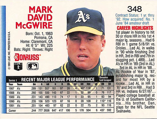 1992 Donruss Mark McGwire Baseball Card #348- Mint Condition