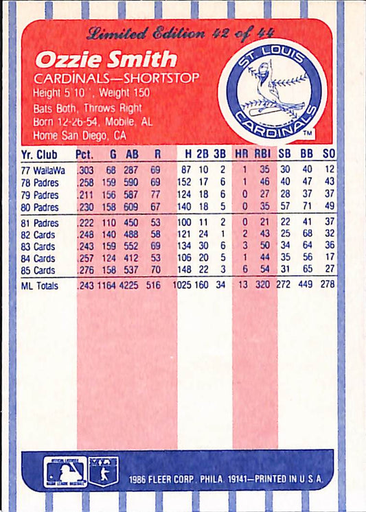 1986 Fleer League Leaders Ozzie Smith Vintage Baseball Card #42 - Mint Condition