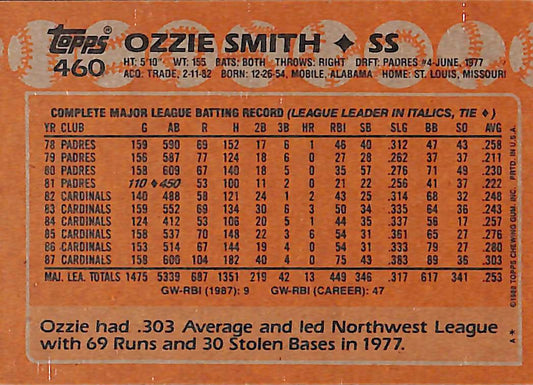 1988 Topps Ozzie Smith MLB Vintage Baseball Card #460 - Mint Condition