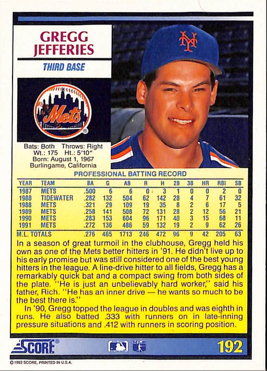 1992 Score Gregg Jefferies MLB Baseball Card #192 - Mint Condition