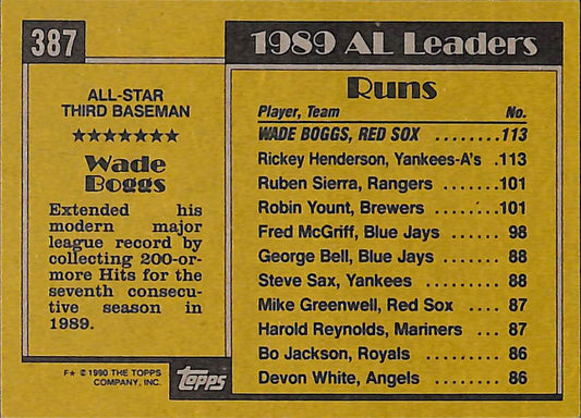 1990 Topps Wade Boggs All Star MLB Baseball Card #387 - Mint Condition