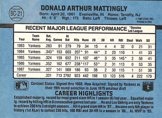 1987 Donruss Don Mattingly MVP Baseball Card #BC-21 - Mint Condition