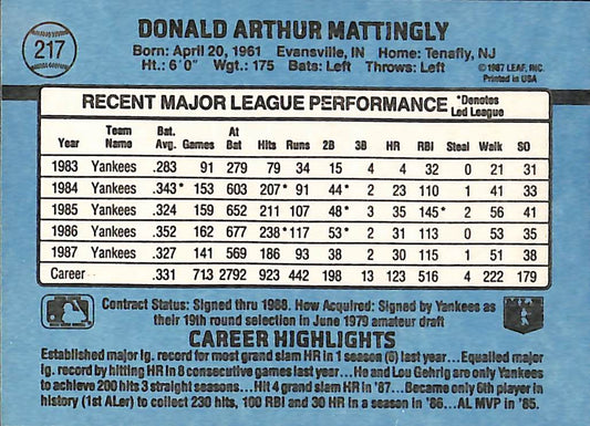 1988 Donruss Don Mattingly Baseball Card #217 - Mint Condition