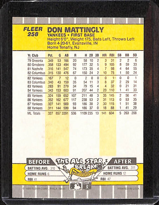 1989 Fleer Don Mattingly Baseball Card #258 - Mint Condition