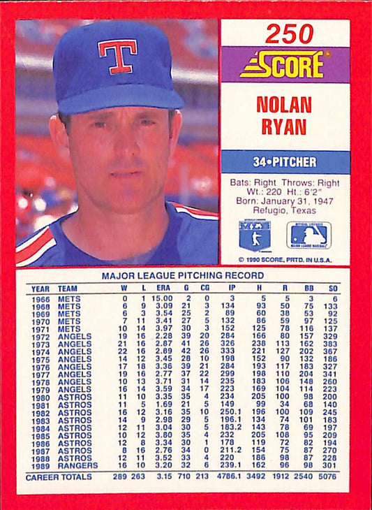 1990 Score Nolan Ryan Rangers Baseball Card #250 - Mint Condition
