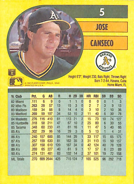 1991 Fleer Jose Canseco Baseball Card #5 - Mint Condition