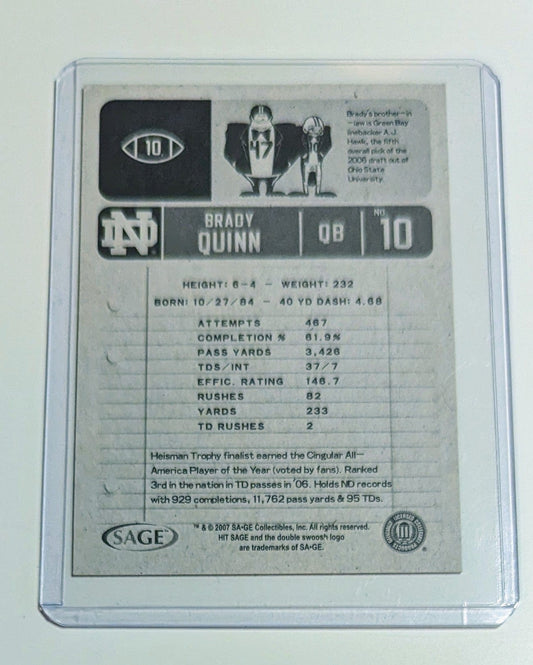 2007 Brady Quinn Football Card #10 Notre Dame - Mint Condition