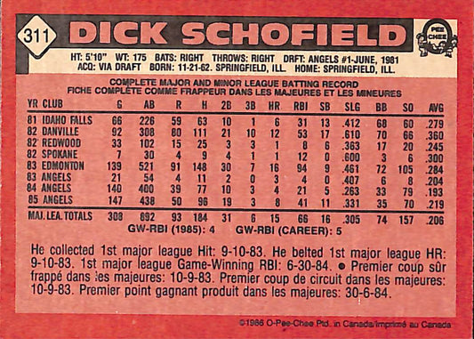 1986 O-Pee-Chee Dick Schofield Vintage MLB Baseball Card #311 - Mint Condition