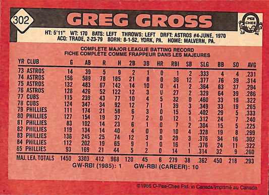 1986 O-Pee-Chee Greg Gross Vintage MLB Baseball Card #302 - Mint Condition
