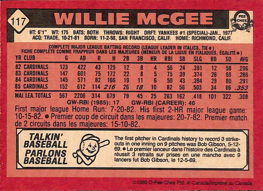 1986 O-Pee-Chee Willie Mcgee Vintage MLB Baseball Card #117 - Mint Condition