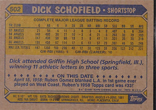 1987 Topps Dick Schofield Vintage MLB Baseball Card #502 - Mint Condition