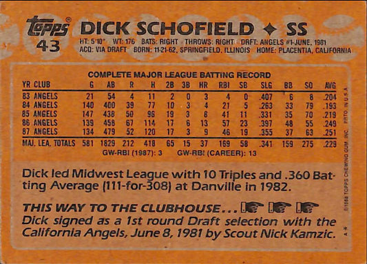 1988 Topps Dick Schofield Vintage MLB Baseball Card #43 - Mint Condition