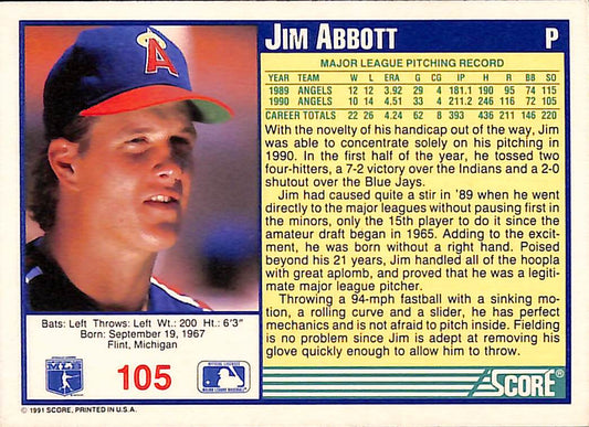 1991 Score Jim Abbott MLB Baseball Card #105 - Mint Condition
