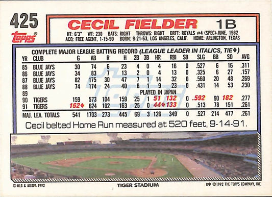 1992 Topps Cecil Fielder MLB Baseball Card #425 - Mint Condition