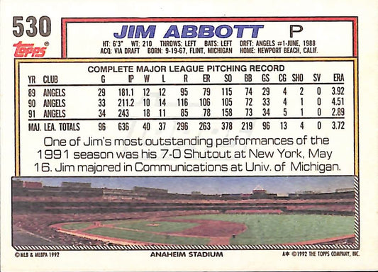 1992 Topps Jim Abbott MLB Baseball Card #530 - Mint Condition