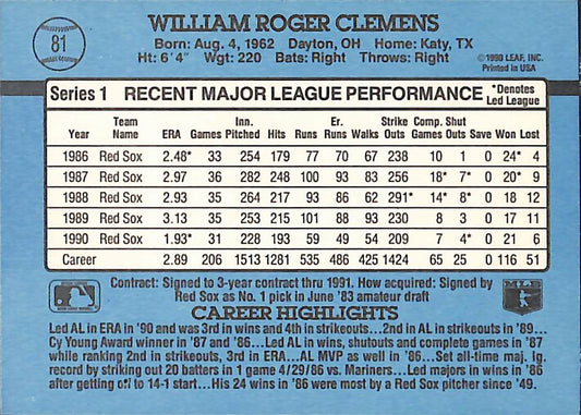 1991 All-Star Donruss Roger Clemens MLB Baseball Card #81 - Mint Condition