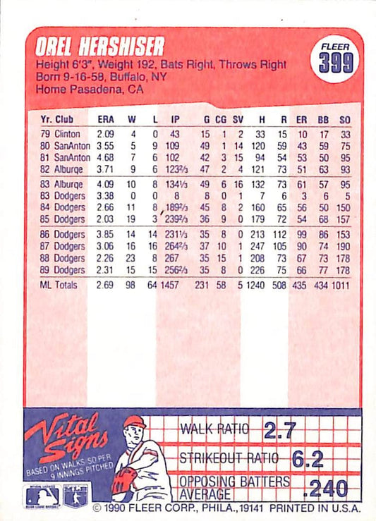 1990 Fleer Oral Hershiser Baseball Player Card #399 - Mint Condition