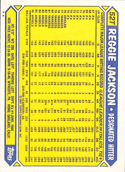 1987 Topps Reggie Jackson Baseball Card #52T - Mint Condition