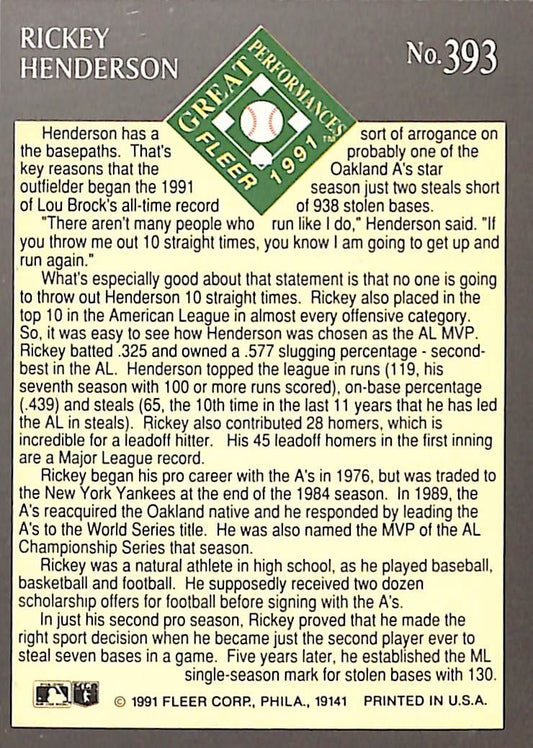 1991 Fleer Great Performer Rickey Henderson Baseball Card #393 - Mint Condition