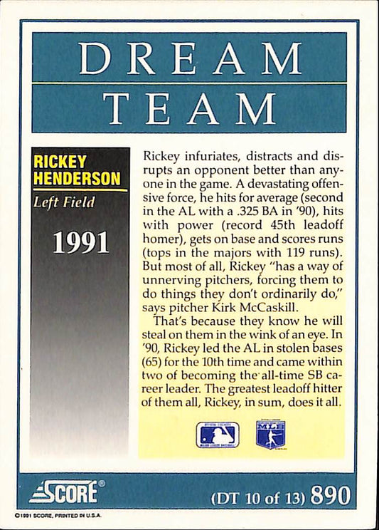 1991 Score Dream Team Rickey Henderson Baseball Card #890 - Mint Condition