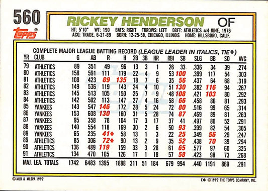 1991 Topps Rickey Henderson Baseball Card #560 - Mint Condition