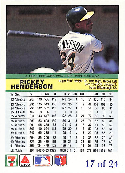 1992 Fleer Rickey Henderson Baseball Card #17 - Mint Condition