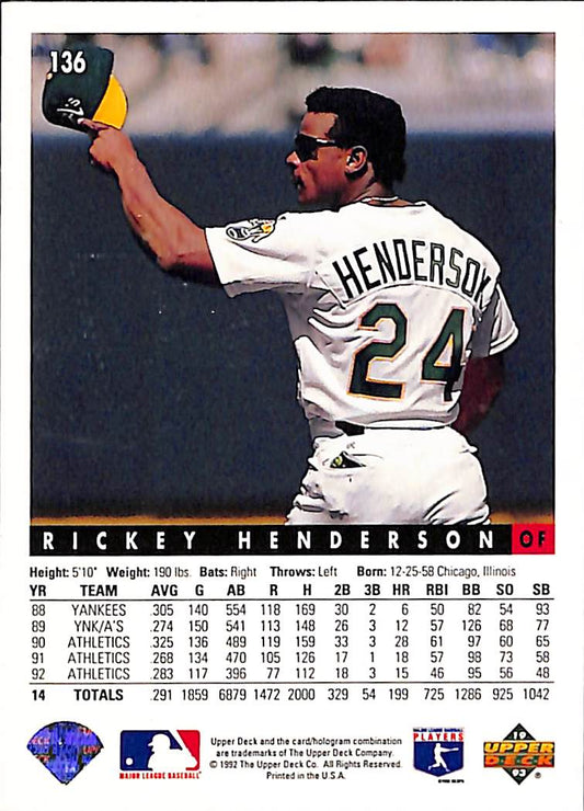 1993 Upper Deck Rickey Henderson Baseball Card #136 - Mint Condition