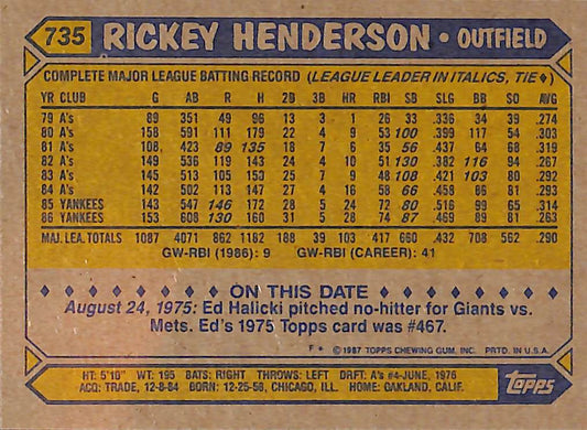 1987 Topps Rickey Henderson Baseball Card #735 - Mint Condition