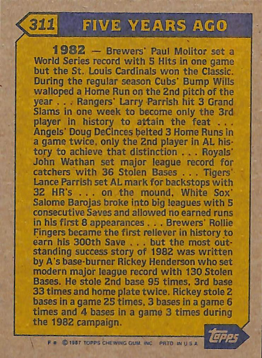 1987 Topps Turn Back The Clock Rickey Henderson Baseball Card #311 - Mint Condition