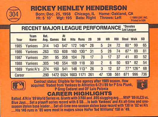 1990 Topps "89 Record Breaker Rickey Henderson Baseball Card #7 - Mint Condition