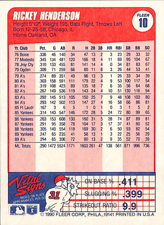1990 Fleer Rickey Henderson Baseball Card #10- Mint Condition