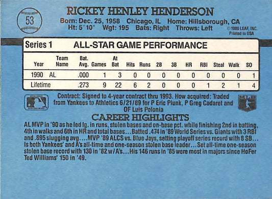 1991 Donruss All-Star Rickey Henderson Baseball Card #53 - Mint Condition