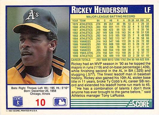 1991 Score Rickey Henderson Baseball Card #10 - Mint Condition