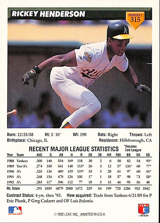 1992 Donruss Rickey Henderson Baseball Card #315 - Mint Condition