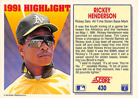 1992 Score All Time Stolen Base Leader Rickey Henderson Baseball Card #430 - Mint Condition