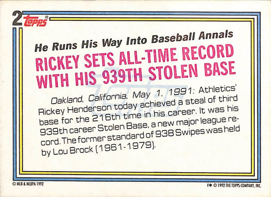 1992 Topps Record Breaker Rickey Henderson MLB Baseball Card #2 - Mint Condition