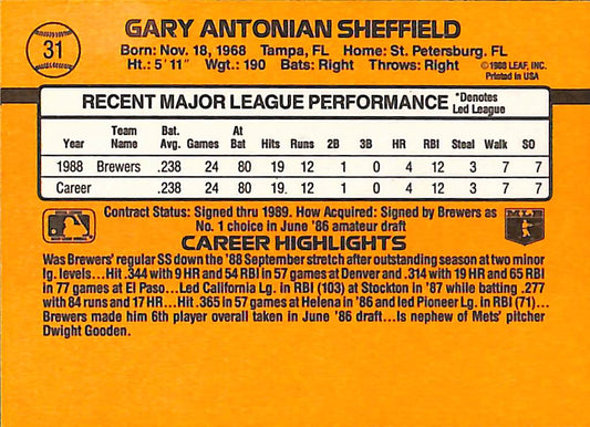 1988 Donruss Rated Rookie Gary Sheffield MLB Baseball Card #31 - Rookie Card - Mint Condition