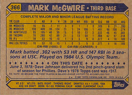 1987 Topps Mark McGwire Rookie MLB Baseball Card #366 - Rookie Card Mint Condition