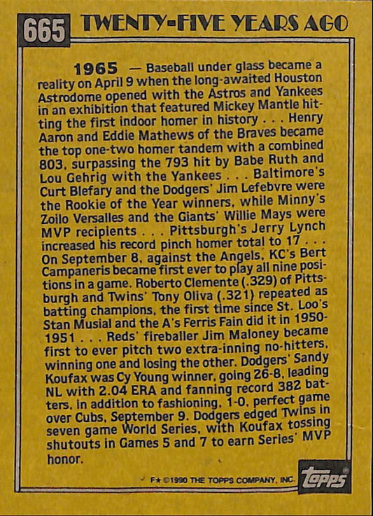 1990 Topps Sandy Koufax Blue Turn Back The Clock Baseball Card #665 - Mint Condition