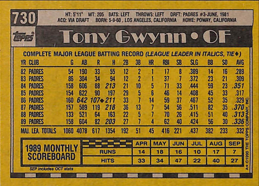 1990 Topps Tony Gwynn Baseball Card #730 - Mint Condition