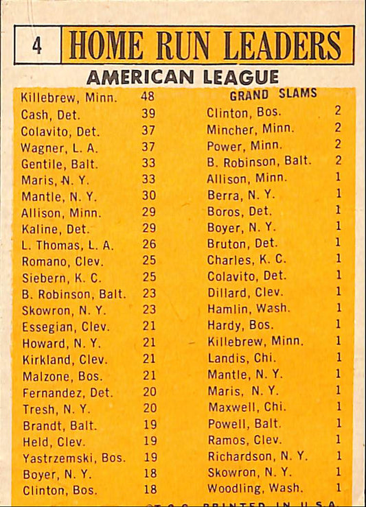 1963 AL Topps Home Run Leaders Roger Maris Baseball Card #4 - Mint Condition