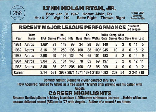 1986 Donruss Nolan Ryan MLB Vintage Baseball Card #258 - Mint Condition