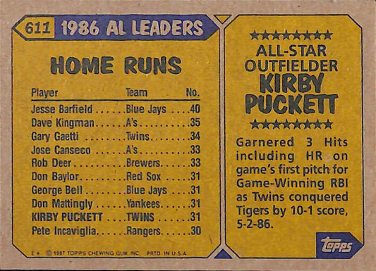 1987 Topps All-Star Kirby Puckett MLB Vintage Baseball Card #611 - Mint Condition